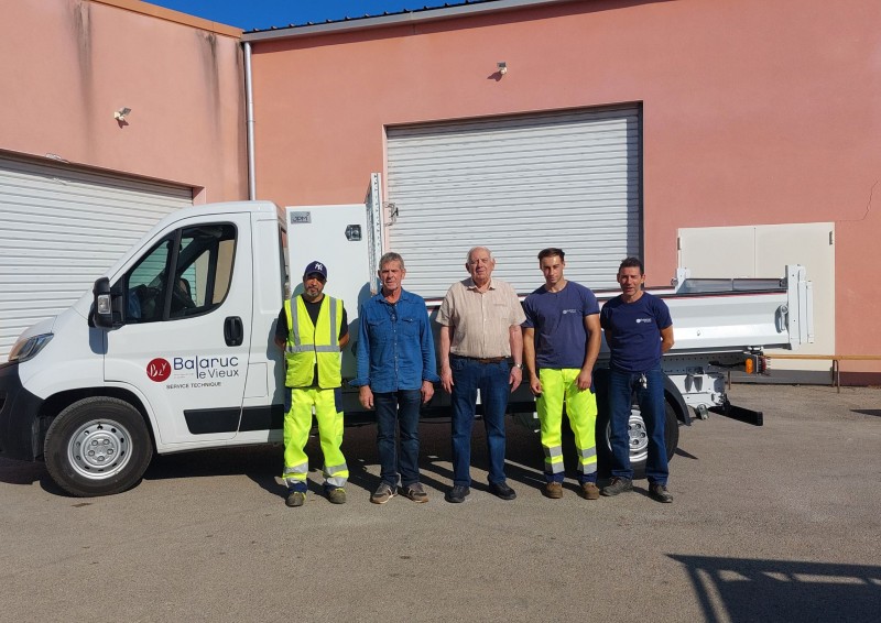 Légende photo: Monsieur Norbert CHAPLIN, Maire, Monsieur Marcel BOSC Adjoint au maire délégué aux travaux, Philippe GALLART, Responsable des services techniques, Axel SUBIRATS et Jean-François BRUNI agents des services techniques réceptionnant le nouveau véhicule