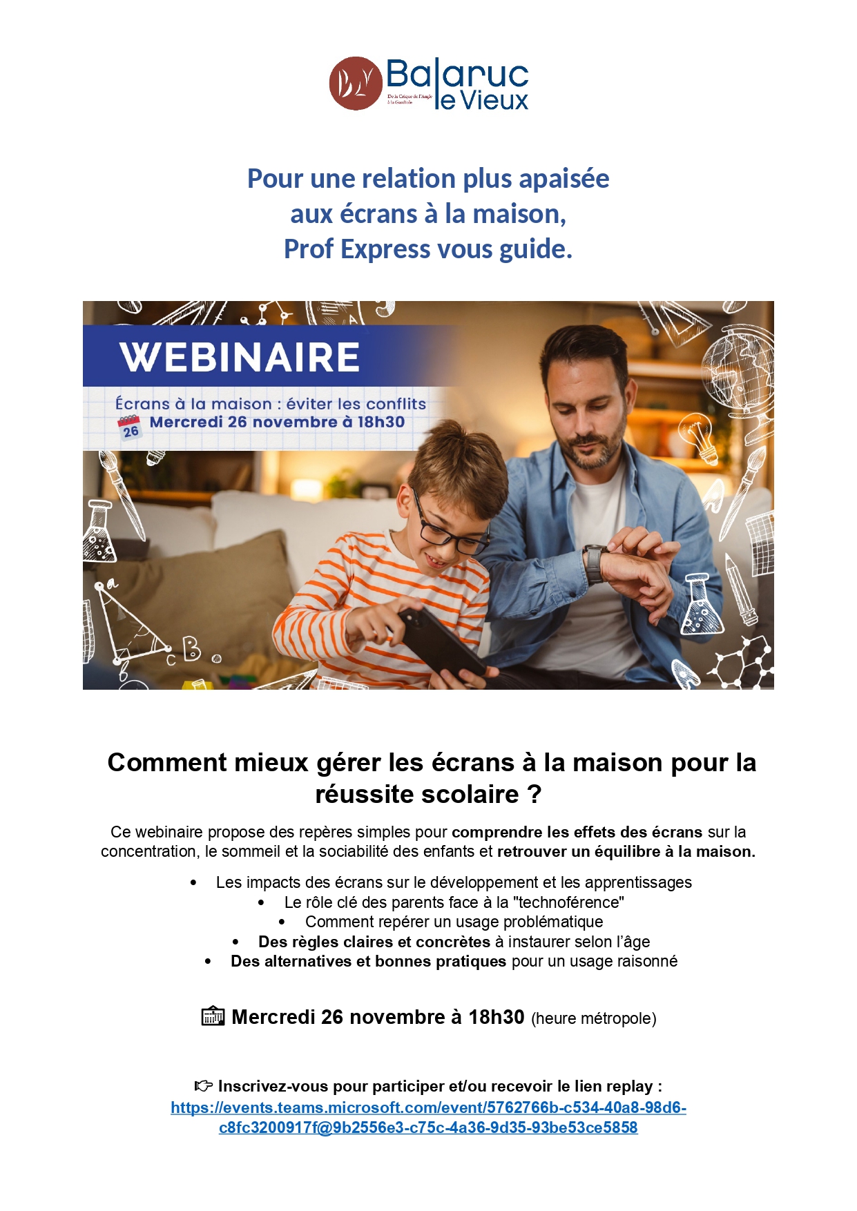 Ce webinaire propose des repères simples pour comprendre les effets des écrans sur la concentration, le sommeil et la sociabilité des enfants et retrouver un équilibre à la maison.